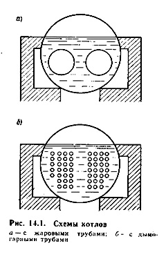 По конструкции паровые котлы можно разделить на два типа – газотрубные и водотрубные. В газотрубных котлах основные поверхности нагрева находятся внутри цилиндрического сосуда большого диаметра в виде так называемых жаровых или дымогарных труб или различных их комбинаций, по которым движутся продукты сгорания топлива. На рис. 14.1 показаны схемы котлов с жаровыми и дымогарными трубами.