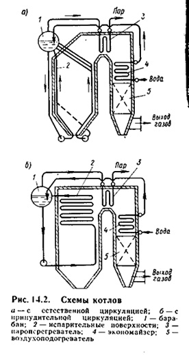При работе парового котла очень важно обеспечить надежное охлаждение поверхностей нагрева, в которых происходит парообразование. Для этого необходимо соответствующим образом организовать движение воды и пароводяной смеси в испарительных поверхностях нагрева. По характеру организации движения рабочего тела в испарительных поверхностях котельные агрегаты делятся на три типа:
