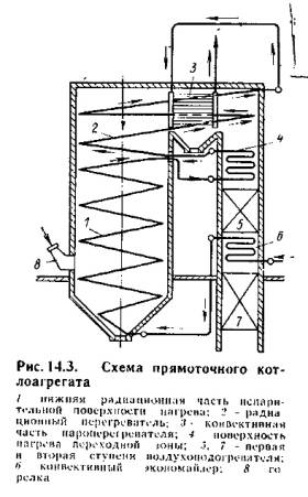 Принципиальная схема прямоточного котла показана на рис 14.3. Питательная вода подается в конвективный экономайзер 6, где она подогревается за счет тепла газов, и поступает в экранные трубы 2, выполненные в виде параллельно включенных змеевиков, расположенных на стенах топочной камеры. В нижней части змеевиков вода нагревается до температуры насыщения. Парообразование до степени сухости 70-75% происходит в змеевиках среднего уровня расположения. Пароводяная смесь затем поступает в переходную конвективную зону 4, где происходит окончательное испарение воды и частичный перегрев пара. Из переходной зоны пар направляется в радиационный перегреватель 2, затем доводится до заданной температуры в конвективном перегревателе 3 и поступает на турбину. В опускной шахте котлоагрегата расположены первая (по ходу газов) и вторая ступени 5 и 7 воздухоподогревателя.