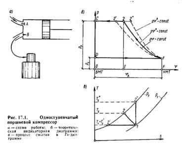 Одноступенчатый поршневой компрессор. На рис.17.1,а показана принципиальная схема одноступенчатого поршневого компрессора. Коленчатый вал компрессора приводится во вращение от электродвигателя или от поршневого двигателя внутреннего сгорания. При движении поршня от ВМТ к НМТ в цилиндр с охлаждаемой рубашкой через автоматически открывающийся клапан А из окружающей среды всасывается газ. Нагнетательный клапан В закрыт под действием давления газов в резервуаре, которое больше атмосферного. При обратном движении поршня от НМТ к ВМТ газ начинает сжиматься, давление его увеличивается, и всасывающий клапан закрывается. Процесс сжатия продолжается до тех пор, пока давление в цилиндре не станет равным (практически несколько больше) давлению в резервуаре. Тогда клапан В открывается, и начинается процесс нагнетания сжатого газа в резервуар до тех пор, пока поршень не придет в ВМТ.