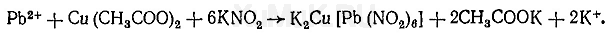 Реакция с ацетатом меди и нитритом калия. На предметное стекло наносят несколько капель водной фазы, которую на небольшом пламени выпаривают досуха. На сухой остаток наносят 1—2 капли 1 %-го раствора ацетата меди и выпаривают досуха. К сухому остатку прибавляют 2—3 капли 30 %-го раствора уксусной кислоты, а затем на край жидкости вносят несколько кристалликов нитрита калия. Образование черных или коричневых кристалликов, имеющих форму куба, указывает на наличие ионов свинца в водной фазе: