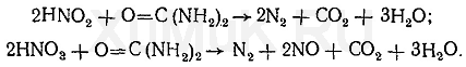Оксиды азота окисляются кислородом воздуха до оксида азота (IV), при взаимодействии которого с водой образуются азотная и азотистая кислоты, разлагающиеся мочевиной, как указано выше.