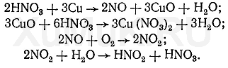 Отгонка азотной кислоты из диализатов. Азотная кислота сразу не перегоняется из разбавленных растворов. Вначале отгоняется вода, а под конец отгоняется и азотная кислота. Поэтому диализаты, содержащие азотную кислоту, отгоняют почти досуха. Прибавление медных опилок к диализатам способствует перегонке азотной кислоты. При взаимодействии азотной кислоты с медными опилками образуется оксид азота (II), который кислородом воздуха окисляется до оксида азота (IV). Оксид азота (IV) в приемнике реагирует с водой. В результате этого образуется смесь азотной и азотистой кислот: