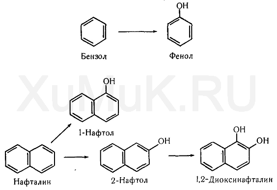 Гидроксилирование ароматических соединений. При окислении бензола в организме под влиянием ферментов образуется фенол, а при окислении нафталина — нафтолы: