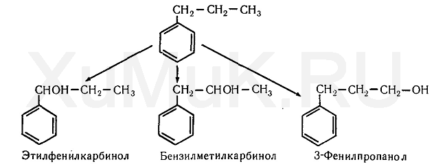 При наличии нескольких атомов углерода в боковой цепи алкильных производных бензола гидроксилирование может происходить при различных атомах углерода. Это можно показать на примере гидроксилирования н-пропилбензола: