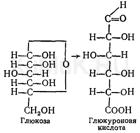 Конъюгация с глюкуроновой кислотой. Глюкуроновая кислота С 6 Н 10 О 7 относится к уроновым кислотам (продуктам окисления альдоз). Она представляет собой альдегидкарбоновую кислоту. При образовании уроновых кислот (в том числе и глюкуроновой) первичная спиртовая группа альдоз окисляется до карбоксильной группы, а альдегидная — остается неизменной. Образование глюкуроновой кислоты из глюкозы происходит по схеме