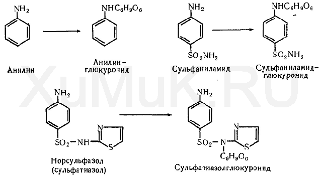 Глюкуроновая кислота с рядом азотсодержащих соединений (аминами, амидами, производными карбаминовых кислот, азотсодержащими гетероциклами и др.) образует N-глюкурониды. Образование из них можно представить следующими схемами: