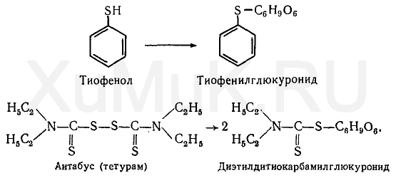Тиофенолы и ряд других органических соединений, содержащих атомы серы, с глюкуроновой кислотой образуют S-глюкуро-ниды:
