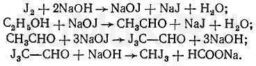 Реакция образования йодоформа. При нагревании этилового спирта с раствором иода и щелочью образуется йодоформ (CHJ 3 ), имеющий специфический запах: