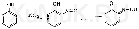 Реакция Либермана. Эта реакция также основана на образовании индофенола. В качестве реактивов на фенолы применяют нитрит натрия и серную кислоту. При взаимодействии нитрита натрия и серной кислоты образуется азотистая кислота, которая с фенолом образует n -нитрозофенол, при изомеризации которого образуется n -хиноидоксим: