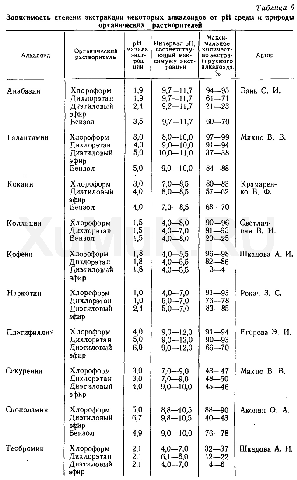 Для каждого алкалоида имеется область значений рН, при которой он экстрагируется несмешивающимися с водой органическими растворителями в максимальных количествах. В дальнейшем этот интервал значений рН будем называть областью максимума экстракции. Известны алкалоиды (колхицин, кофеин, наркотин, теобромин и др.), область максимума экстракции которых находится в кислой среде или на границе кислой и щелочной сред. Однако в определенных количествах эти алкалоиды экстрагируются и из щелочной среды. Алкалоиды, область максимума экстракции которых находится в щелочной среде, частично экстрагируются и из кислой среды. Область максимума экстракции некоторых алкалоидов зависит и от природы органических растворителей, применяемых для извлечения этих веществ из водных растворов и алкалоидных вытяжек из биологического материала.