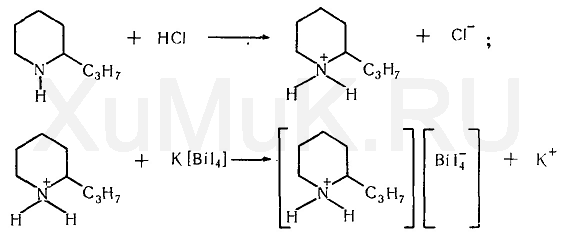 Образование ионных ассоциатов алкалоидов с одним из реактивов группового осаждения алкалоидов (реактивом Драгендорфа) на примере кониина можно представить следующим уравнением: