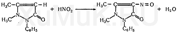 Реакция образования нитрозоантипирина. При взаимодействии антипирина с азотистой кислотой образуется нитрозоантипирин, имеющий зеленую окраску: