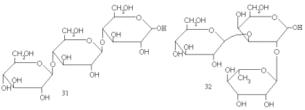 По той же схеме, по которой строятся дисахариды, можно связать цепочку из трех моносахаридных остатков. Такие соединения называются трисахаридами. Их примерами могут служить целлотриоза (31) и солатриоза (32). Первая построена из трех остатков D-глюкозы, вторая – из остатков L-рамнозы, D-глюкозы и D-галактозы.