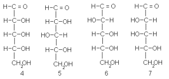Фишер располагал тремя альдозами: глюкозой, маннозой и арабинозой. Для последней, если оперировать с сахарами D-ряда, принципиально возможны четыре конфигурации (4-7):