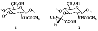 Смешанный биополимер, построенный из полисахаридных цепей и коротких пептидных фрагментов (высокомолекулярный гликопептид), составляет основу структуры стенки бактериальной клетки. Его полисахаридные цепи собраны из правильно чередующихся β -1 à 4-связанных остатков N-ацетил-D-глюкозамина (1) и N-ацетил-мурамовой кислоты (2). Последняя представляет собой простой эфир N-ацетил-D-глюкозамина (по положению 3) и молочной (L- α -оксипропионовой) кислоты.