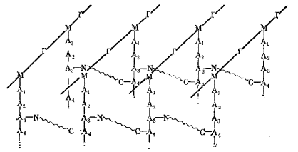 Толстые линии на ней – это полисахаридные цепи, М и Г – остатки N-ацетилмурамовой кислоты и N-ацетил-D-глюкозамина соответственно; тонкие вертикальные линии – пептидные цепи (N-конец наверху), А 1, А 2 и т.д. - остатки аминокислот, волнистые линии – пентапептидный фрагмент из остатков глицина, латинскими буквами обозначены его N- и C-концы.