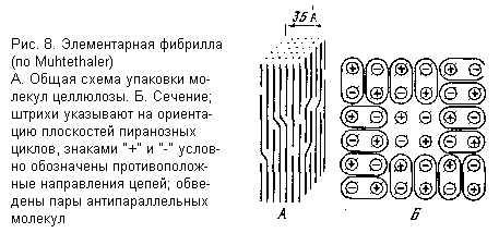 Помимо строго упорядоченных кристаллических участков, структура которых была только что рассмотрена, в нативных микрофибриллах имеются также и аморфные (или, по крайней мере, менее упорядоченные) участки, где целлюлозные цепи упакованы более рыхло. Вопрос об относительном содержании аморфных и кристаллических участков и об их взаимном расположении в элементарных фибриллах и микрофибриллах до сих пор остается дискуссионным из-за отсутствия бесспорных методов для прямого экспериментального определения этих характеристик. Однако факт существования в нативных целлюлозах двух типов надмолекулярных структур не вызывает сомнения. Такие участки резко различаются по реакционной способности, что непосредственно проявляется в химических экспериментах.