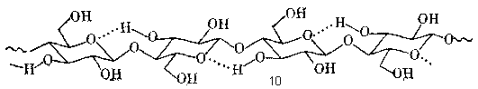 Внутри кристаллических областей элементарной фибриллы молекулы целлюлозы имеют строго упорядоченную конформацию жесткого стержня, в котором соседние глюкопиранозные остатки повернуты один относительно другого на 180 ° . Такая конформация закреплена внутримолекулярными водородными связями, соединяющими каждую пару соседних остатков. Гидроксильная группа при С-3 выступает в роли донора протона, а кислород соседнего слева остатка – в роли акцептора. Фрагмент такой структуры представлен ниже (10):