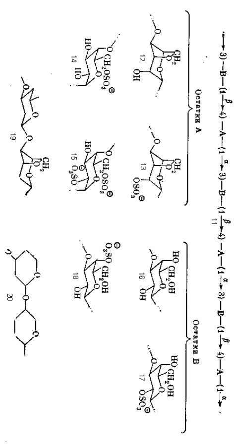 Как видно уже из структуры остатков типа А и В (12-18), число и положение сульфатных групп может варьировать в довольно широких пределах, но явно недопустимым представляется, например, наличие в остатках типа А сульфогруппы в положении 3 или ее отсутствие в положение 6 на стадии биосинтеза, предшествующей циклизации, так как из таких остатков не могли бы образовываться ангидрозвенья.