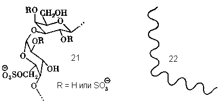 Следовательно, в структуре гелеобразующего полисахарида должны быть и регулярные последовательности типа 19, и нарушения регулярности, места, где конформация цепи резко меняется. Такую роль играют варианты звеньев типа А – сульфаты 14 и 15. Действительно, конформация дисахаридного блока –А-В- с участием (21) резко отличается от таковой для блока с 3,6-ангидрозвеном (19). Поэтому в тех точках цепи, где звено типа 12 или 13 заменено на сульфатированное звено типа 14 или 15, правильная спираль претерпевает излом (22) и связка цепей в виде двойной спирали в этом месте нарушается. Отсюда видно, что отклонения от регулярности, дефекты правильной структуры, суть не ошибки биосинтеза, как может показаться на первый взгляд, а биологически осмысленный, функционально необходимый элемент структуры.