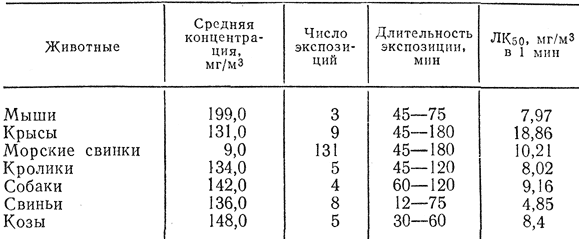 Животные. При вдыхании α-бромбензилцианида у морских свинок, кроликов, собак, свиней, обезьян — возбуждение, слюнотечение, через 60—90 мин — учащенное и затрудненное дыхание. У кроликов особенно страдали глаза вплоть до изъязвлений роговицы, но при высоких концентрациях поражаются и легкие. У собак рвота, иногда отек гортани, понос со значительным обезвоживанием. Та же картина у коз, свиней. Явления раздражения довольно быстро исчезали у обезьян, но у них сильнее поражались дыхательные пути. Наименее чувствительны крысы (Oberst et al.). Токсичность α-бромбензилцианида для разных животных: