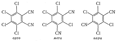 Токсическое действие. При введении ο-тетрахлорфталодинитрила действие развивается медленно, а при м-тетрахлорфталодинитриле угнетение обнаруживается в течение 10 мин и иногда сопровождается спастическими судорогами задних конечностей; п-тетрахлорфталодинитрил вызывает угнетение, накопление жидкости в брюшной полости через 3—4 дня. У хлорированных фталодинитрилов отсутствует судорожное действие, известное для фталодинитрилов. При введении через рот (гибель в течение 24 ч) ο-тетрахлорфталодинитрила ЛД50 = 13,7÷14,2, м-тетрахлорфталодинитрила — 6,0 г/кг, а при введении в брюшину п-тетрахлорфталодинитрила — 2,79 г/кг. Наиболее токсичен м-тетрахлорфталодинитрил. Различия в токсичности, возможно, связаны со структурой изомеров или метаболитами, однако последние еще не изучены (Yoshikawa, Kowai).