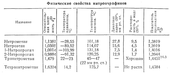 Физические свойства. Низшие мононитропарафины — бесцветные пахучие жидкости, плохо растворимые в воде, смешиваются со спиртом, эфиром и другими органическими растворителями. Перегоняются при атмосферном давлении без разложения. См. также таблицу.